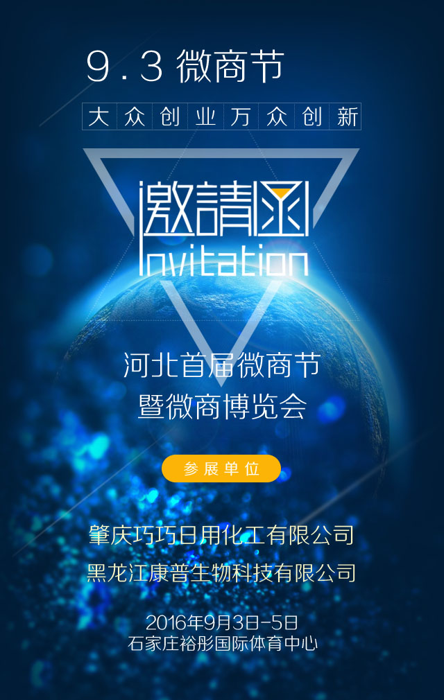 巧巧日化將攜手康普生物科技有限公司于2016年9月3日參加河北微商節(jié),歡迎廣大新老朋友屆時蒞臨指導(dǎo)。查看我們的產(chǎn)品,并與我們進(jìn)行面對面的深入交流!
